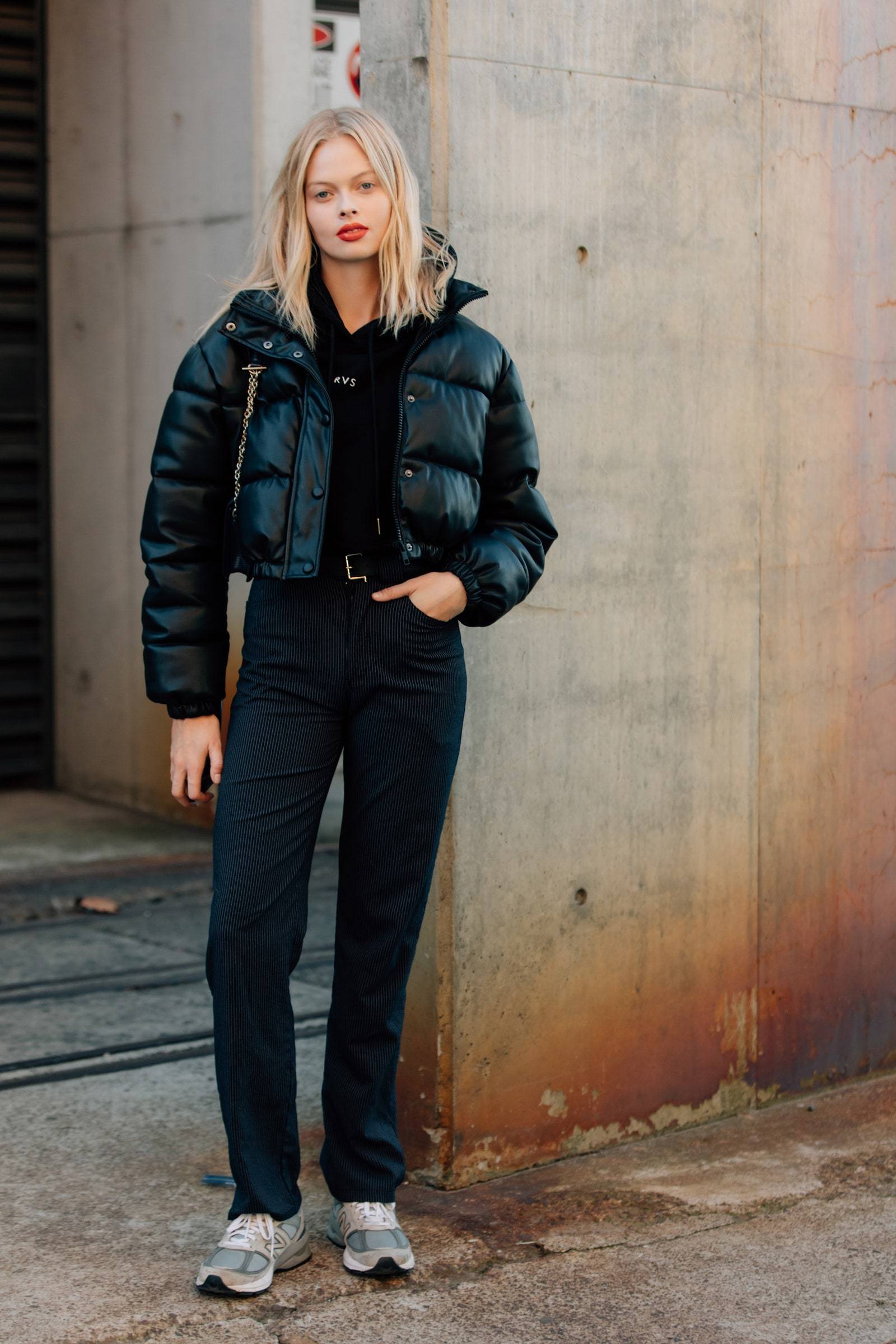 Кожаные пальто носят не только с элегантными юбками. Дизайнеры продвигают их в сочетании со спортивным повседневным образом.