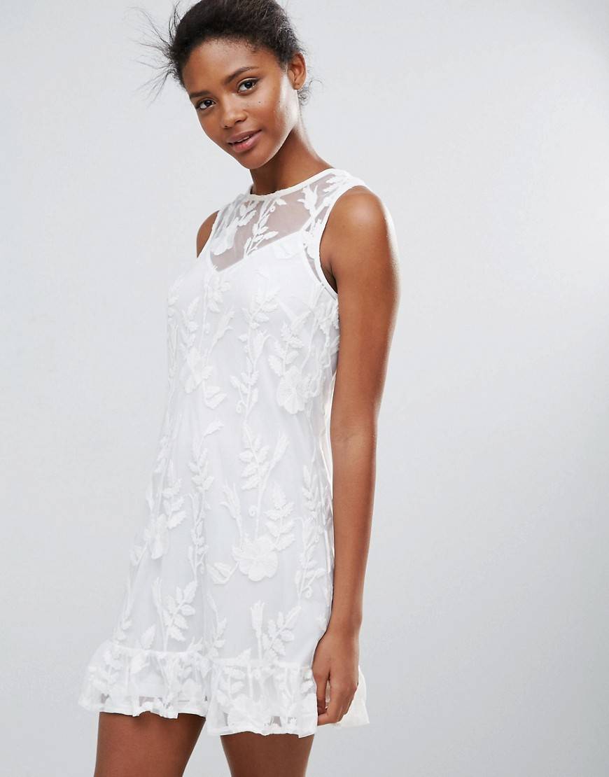 Белое платье мини с кружевом — фасон для самых смелых и уверенных в себе молодых девушек. Юбка практически полностью открывает ноги, при этом сковывает движения. В таком платье удобно отправиться на прогулку по пляжу, по набережной или по летнему парку, а также на шумную вечеринку или дискотеку. Наряд шикарно смотрится на обладательницах стройных ног, а подчеркнуть их можно с помощью туфель как на высоком каблуке, так и на плоской подошве.