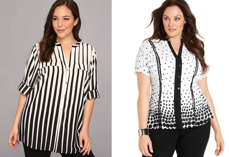 Кутюрье не перестают удивлять полных девушек разнообразием блуз с геометрическими рисунками. Из сезона в сезон они необычайно популярны. Мелкая клетка и горох, ромбы и круги разного диаметра, горошек и квадраты, а еще вертикальные, горизонтальные, диагональные полоски — уже на протяжении многих лет эти прекрасные блузы не сдают своих лидирующих позиций и помогают полным девушкам казаться стройнее.