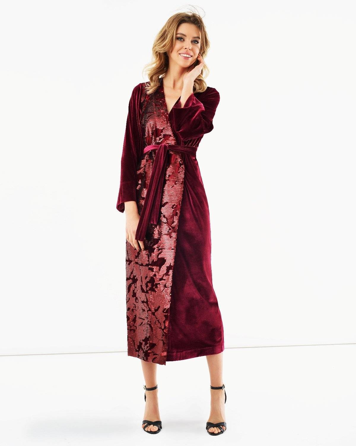Длиннополый наряд напоминает обычный банный халат только по крою с запахом. В остальном он уникален: драпировка делает фигуру стройнее, а благородный материал и минималистичный декор вписываются даже в торжественные образы.