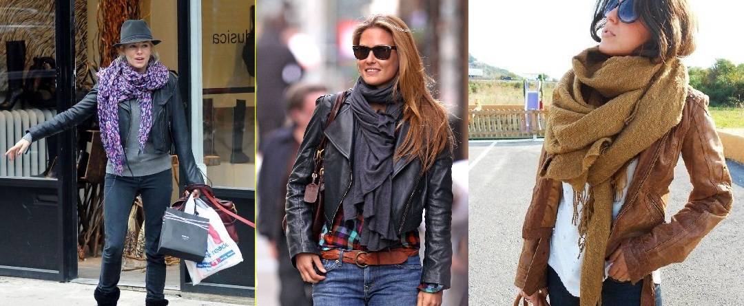 С кожаной курткой, которые чаще всего бывают черного и других нейтральных цветов, отлично смотрятся шарфики практически любого цвета и с любыми узорами. Яркие оттенки придадут комплекту более нарядный и свежий вид.
