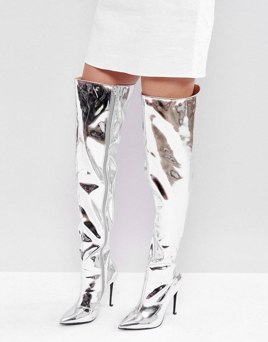 В сочетании с классическим образом в темных оттенках интересно смотрятся серебристые ботфорты. Такой космический образ полюбился модницами в последнем сезоне