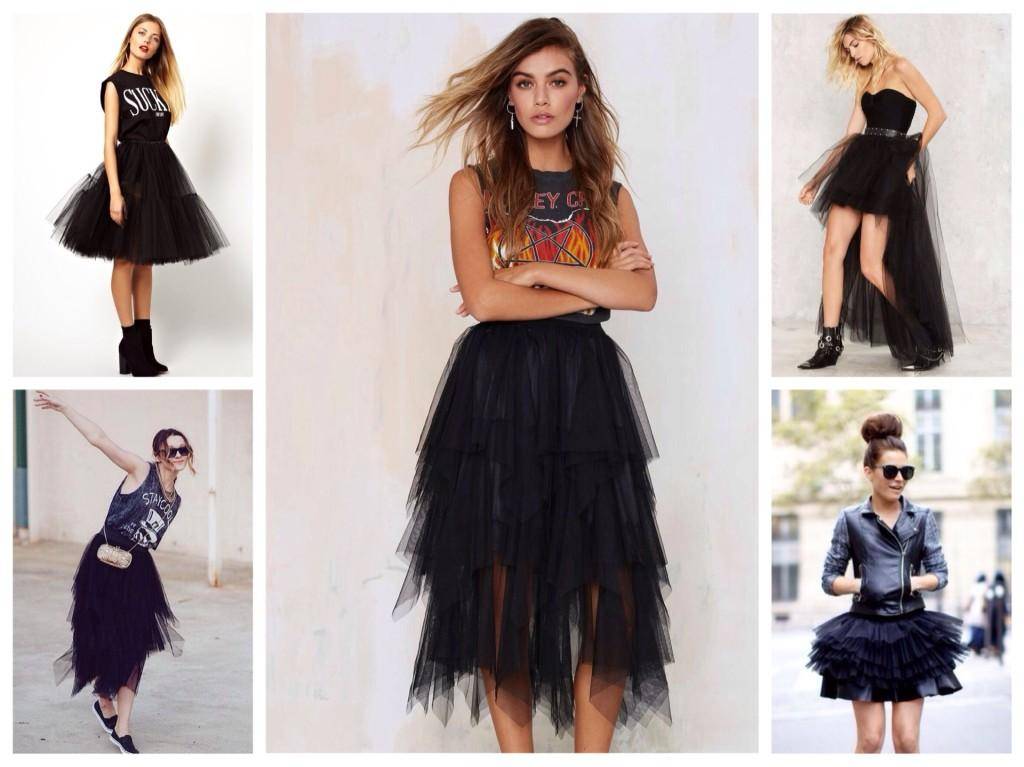 Модная черная юбка позволяет создать невероятно романтичный образ. Для этого лишь нужно подобрать подходящий ансамбль. Верх в данном случае рекомендуется подбирать однотонный, достаточно сдержанный. Обувь в идеале нужно использовать классическую. Правда, также уместна игра контрастов. Пачка эффектно выглядит в тандеме с массивными ботинками, оснащенными шнуровкой, а также курточкой косухой.