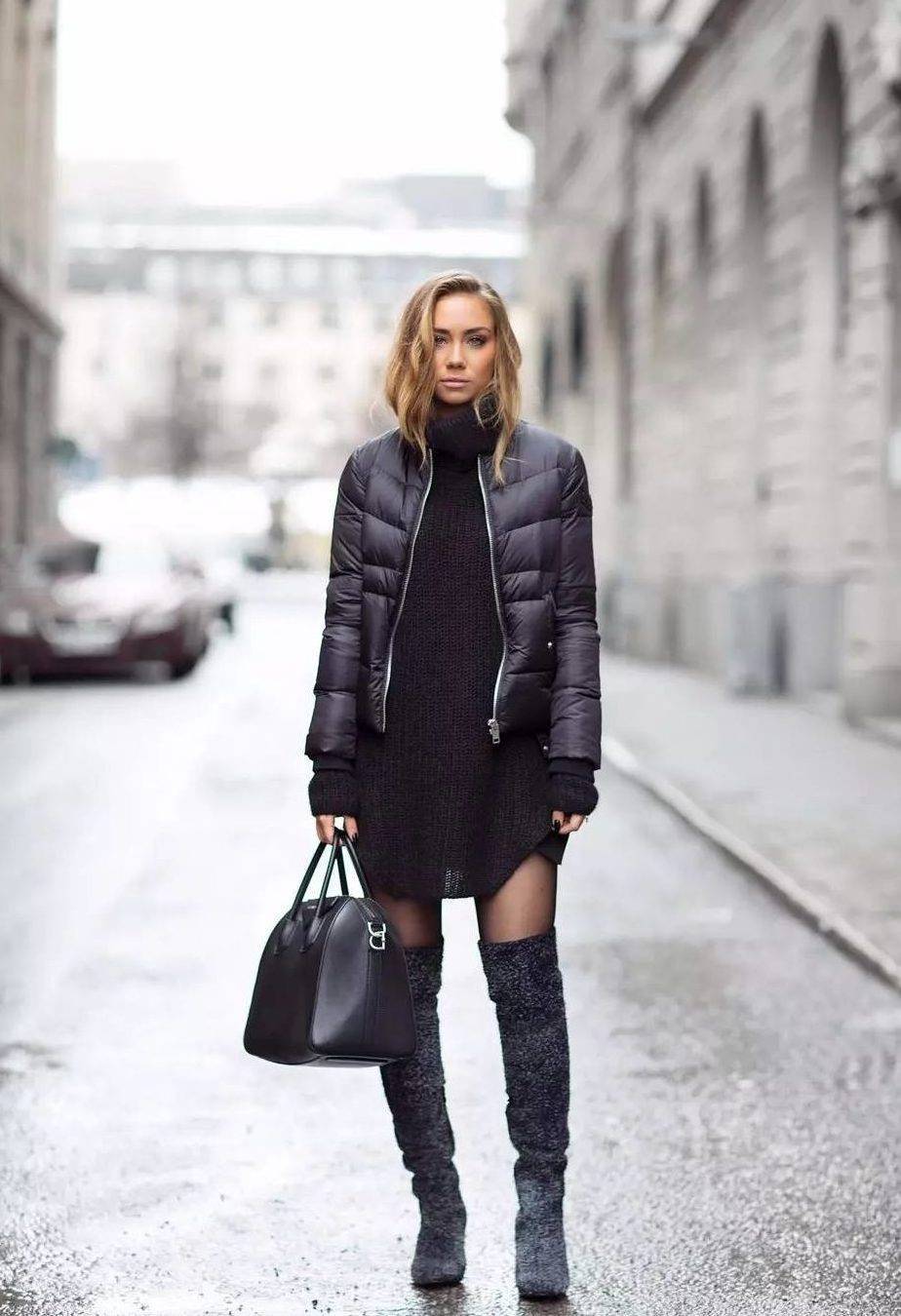 На выбор модниц множество самых разных сочетаний, потому что ботфорты не слишком требовательны к верхней одежде. Варианты зависят от того, куда планируете идти, какая погода и сезон «на дворе».