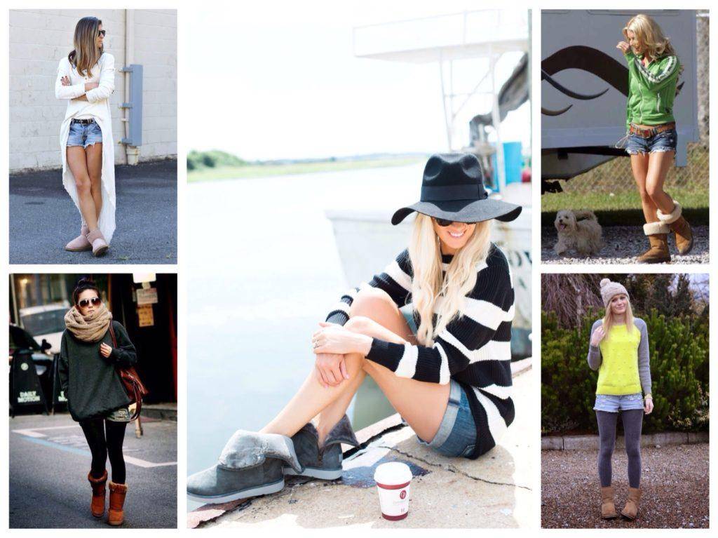 Подобные женские сапоги и шорты — неожиданное сочетание. Такое решение может показаться смелым. Хотя если это модель из теплой ткани, которую нужно носить вместе с колготками, то смотреться она будет хорошо. Но некоторые девушки предпочитают носить угги с джинсовыми шортами и футболкой, выбирая при этом как классические модели, так и оригинальные, украшенные стразами.