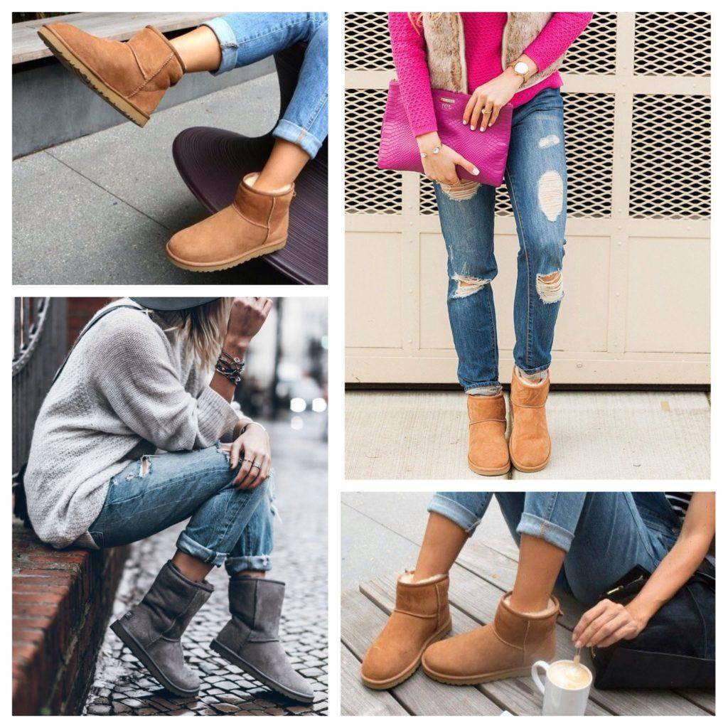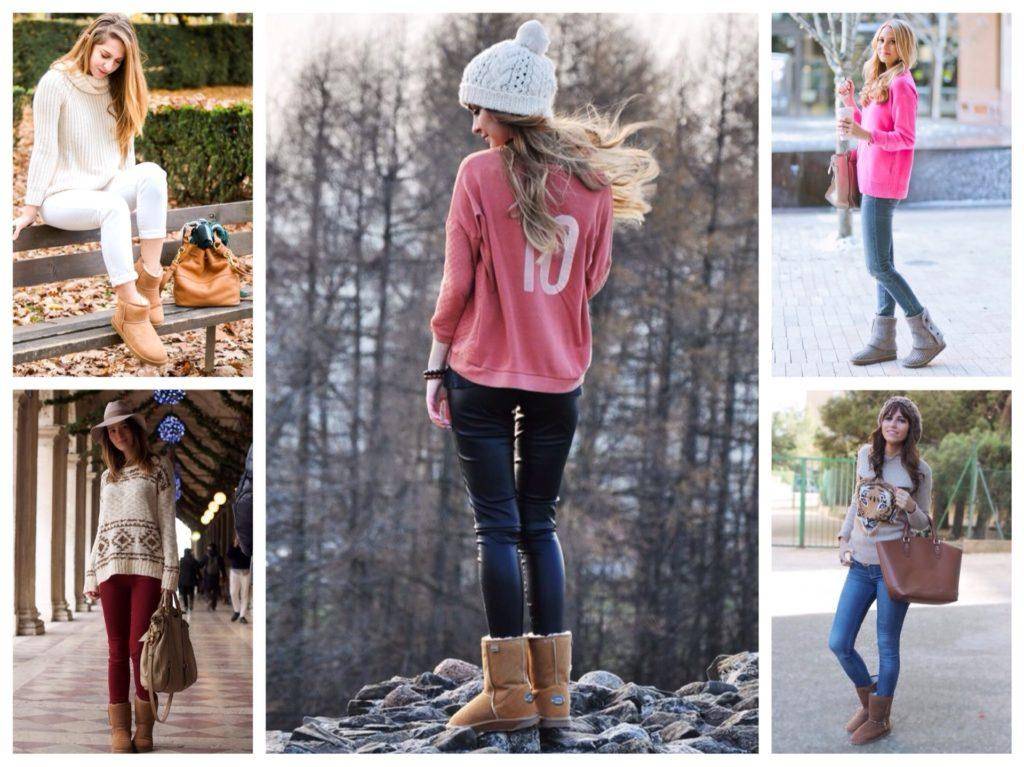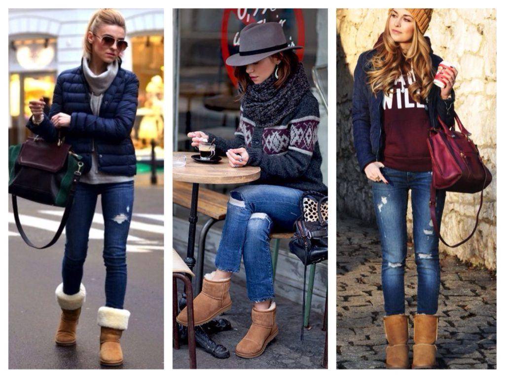 Более подходящее дополнение, чем джинсы сложно подобрать. Идеальный вариант – современные скинни, зауженные. Их удобно заправлять внутрь обуви, при этом высота сапог роли не играет. Под короткие угги можно носить с подвёрнутыми до уровня икр джинсами. Наверх уместно надевать вязаные свитера, короткие куртки, шубки с длиной до середины бедра.