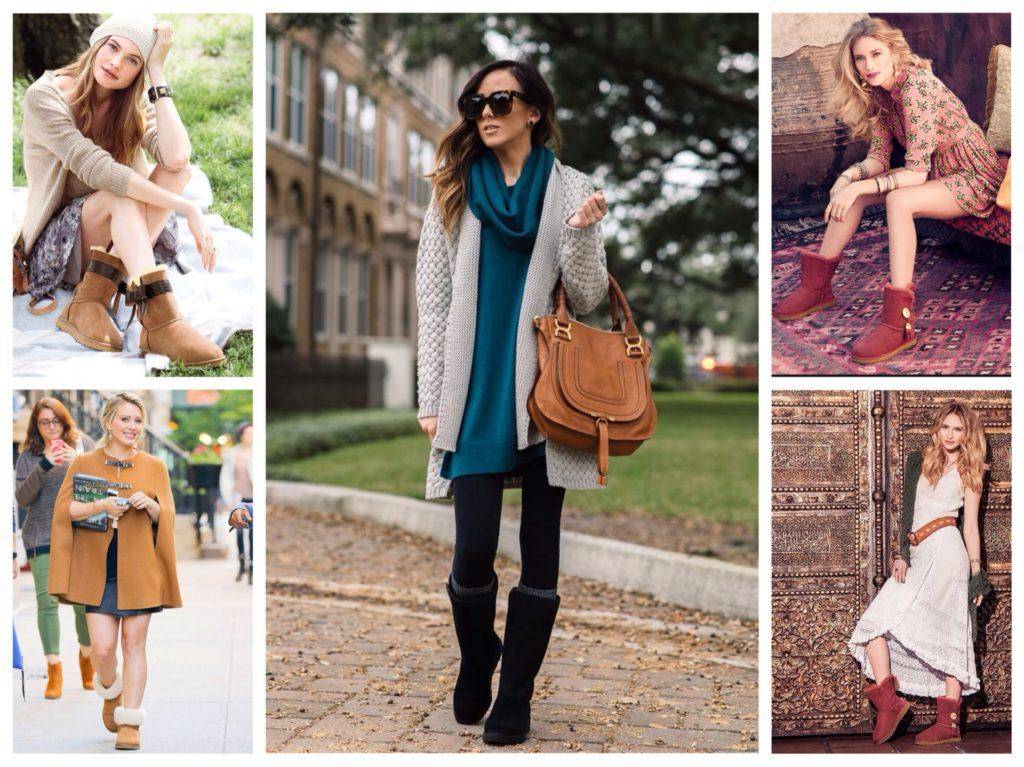 Удлинённые свитера, платья, юбки можно смело носить с уггами. Их максимальная длина – выше колена. Идеальными вариантами считаются вязаные или трикотажные изделия. Длинна платья не должна быть ниже колена (до середины икры или щиколотки, иначе в таком аутфите фигура будет выглядеть непропорционально.