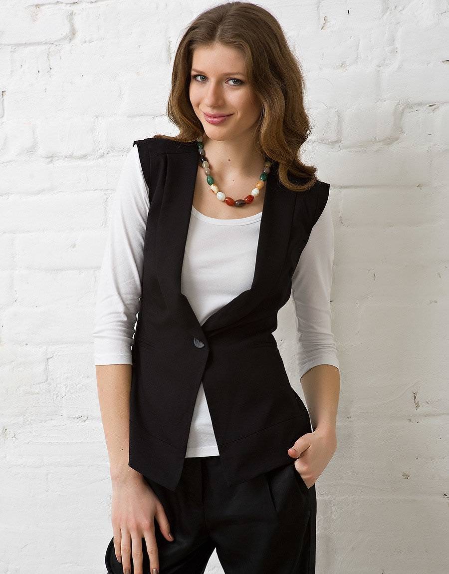Создать деловой образ поможет жилетка мужского фасона. Цвет в большинстве случаев встречается черный или серый, длина короткая, крой прямой или немного приталенный. Никаких лишних деталей и линий. Идеально сочетается с классическими брюками.