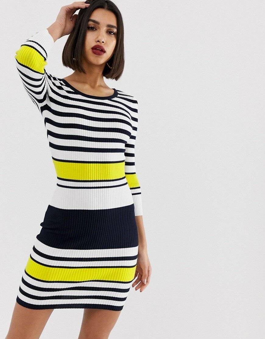 Все вязаные платья можно разделить на несколько категорий: из плотной пряжи, тонкого трикотажа и ажурные. Полосатые наряды могут иметь в своем узоре как два цвета (на манер матроски), так и до 4-х и более цветов. При этом ширина узора может различаться по все длине изделия. Например, желтая полоса узкая, следом более широкая синяя и красная и т.д.