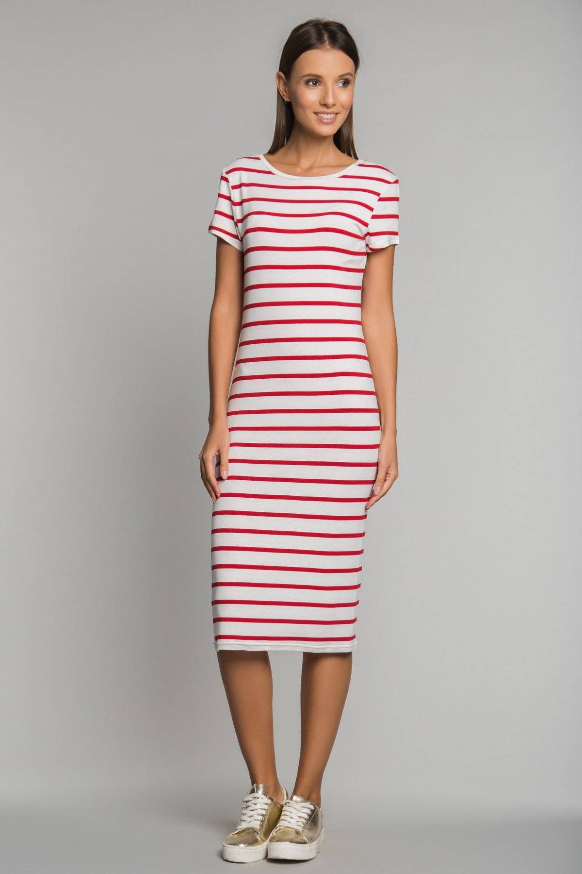 Весьма эффектно и выигрышно смотрится наряд в бело-красную полоску. Такой узор будет к лицу, как блондинкам, так и брюнеткам.