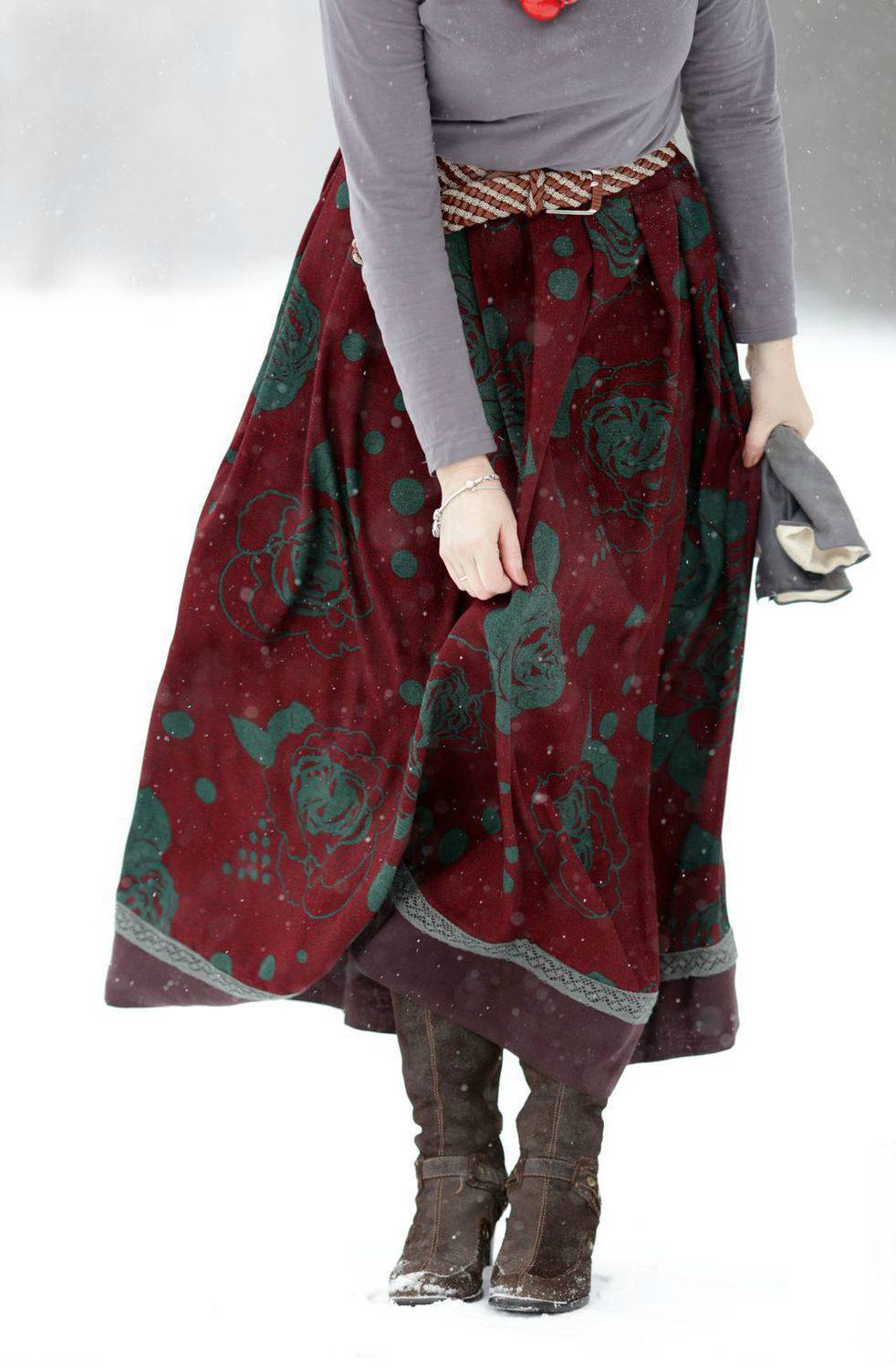 В рамках зимних аутфитов длинная юбка лучше всего смотрится с сапогами до и выше колена. Лучшим вариантом для такой комбинации станет юбка с разрезом (вам же не захочется прятать сапоги). Ботфорты и сапоги лучше всего выглядят с принтованными или узорчатыми макси.