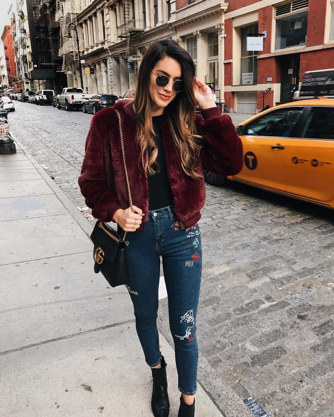 Бомбер-американка, то есть кофта, колоритен сам по себе и не требует аксессуаров вовсе либо обходится минимумом. Куртку в любом случае нужно дополнить сумкой. Подойдут плоские клатчи, спортивные рюкзачки, мягкие торбы и шопперы.