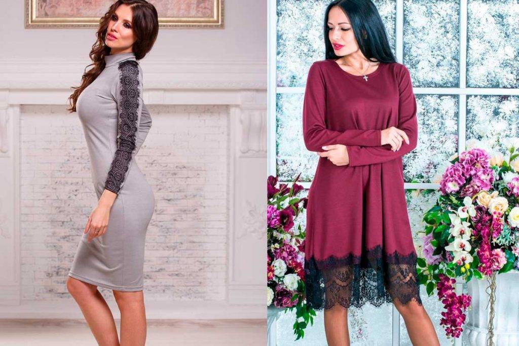 Кружево будет гармонично смотреться в модели платья из тонкого трикотажа. Кожаные вставки более уместными будут в одежде для холодного сезона.