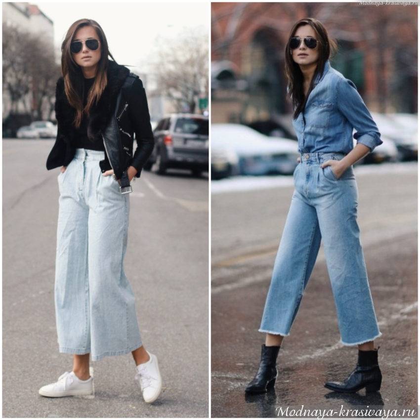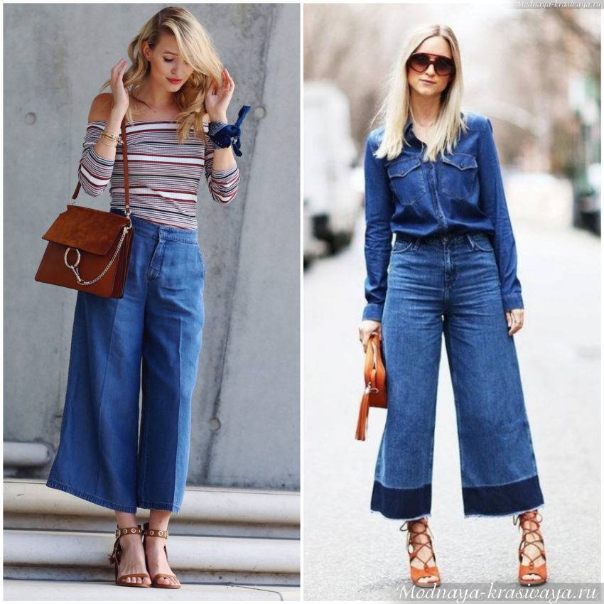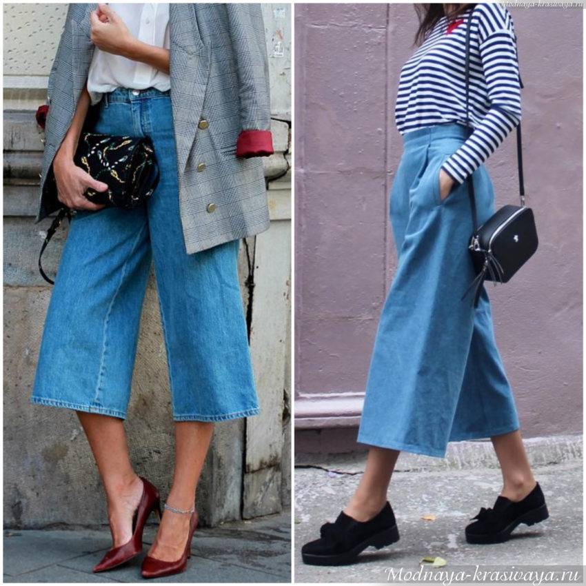 Кюлоты – самые трендовые женские брюки 2021 года, не удивительно, что джинсовые кюлоты тоже на пике популярности. Женственные, стильные и очень модные. Если не знаете с чем их носить, сразу вспоминайте, с чем надеваете расклешенную миди-юбку, принцип тот же. Чтобы визуально не укоротить ноги, носите кюлоты с каблуками. Мюли или босоножки, даже на крошечном каблучке, уже сделают силуэт более вытянутым и стройным.