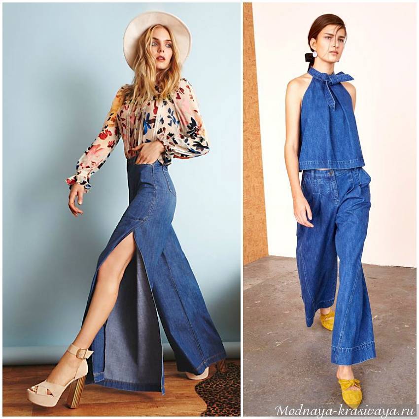 Идеальный вариант для теплого времени года. Палаццо из тонкого денима выглядят стильно и романтично. В этом сезоне также актуальны модели с разрезами по бокам или спереди.