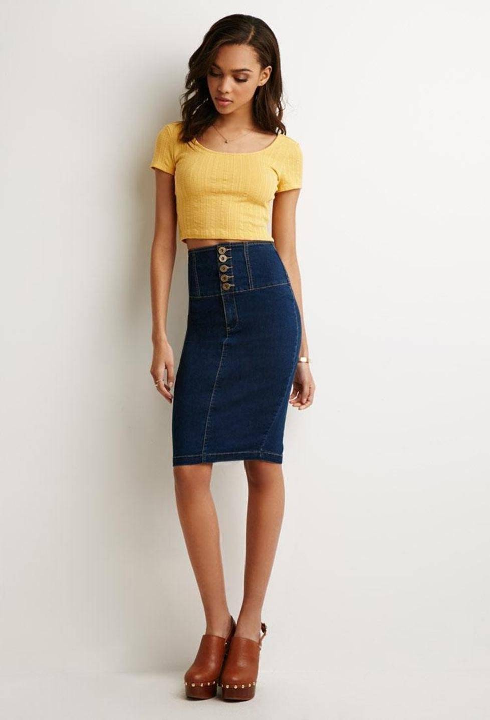 Джинсовая юбка-карандаш незаменима для работы в офисе, да и не только. Она выгодно подчеркивает талию и линию бедер. Высокий каблук к длине миди сделает образ привлекательным. Если к карандашу купить несколько однотонных блузок разных цветов и подобрать к ним неброские бусы или чокеры, то считайте, что на работу у вас есть, что надеть.