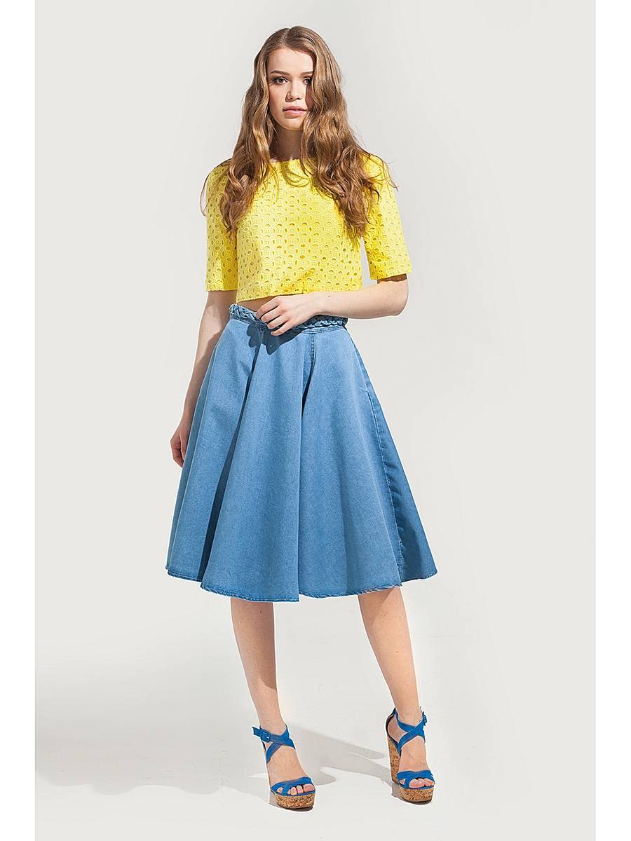 Джинсовая юбка фасона солнце, нравится современным модельерам, так как такое изделие – это плацдарм для экспериментов.