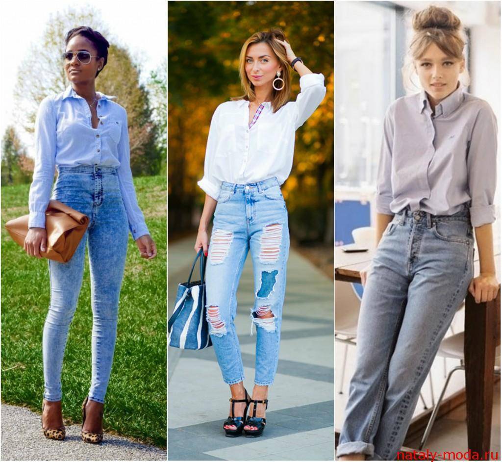 Блузки самых разных фасонов можно комбинировать с высокими джинсами. Однотонные и с принтами, простые и с декором — главное обувь должна гармонировать и поддерживать образ.