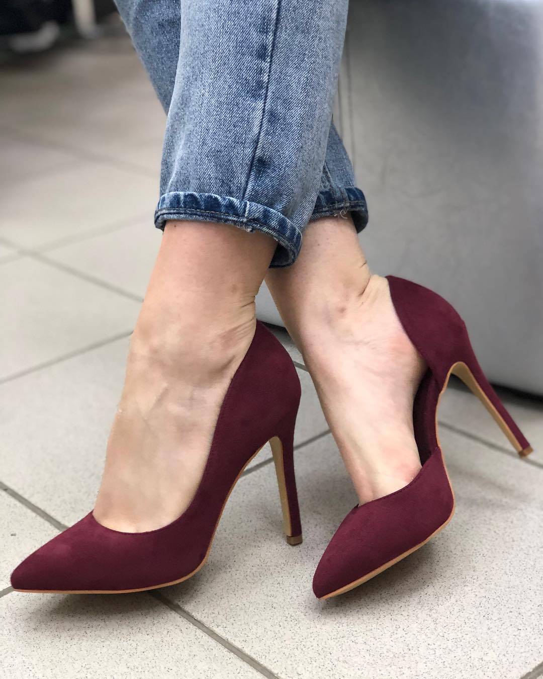 Элегантная замшевая обувь имеет особый шарм. Она прекрасно сочетается с атласом и кружевом. Такие туфли украсят даже самый сдержанный и лаконичный наряд. Дизайнеры рекомендуют сочетать бордовую обувь с костюмами и платьями глубокого синего или зелёного цвета.