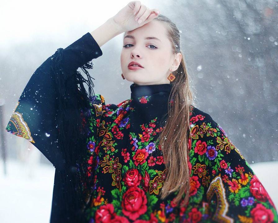 Альтернативой верхней одежды станет приталенный кафтан на пуговицах, отороченный пуховой отделкой. Завершением броского образа послужат платки с набивными узорами в национальной расцветке. Можно подобрать алые сапоги в качестве единения с русским стилем.