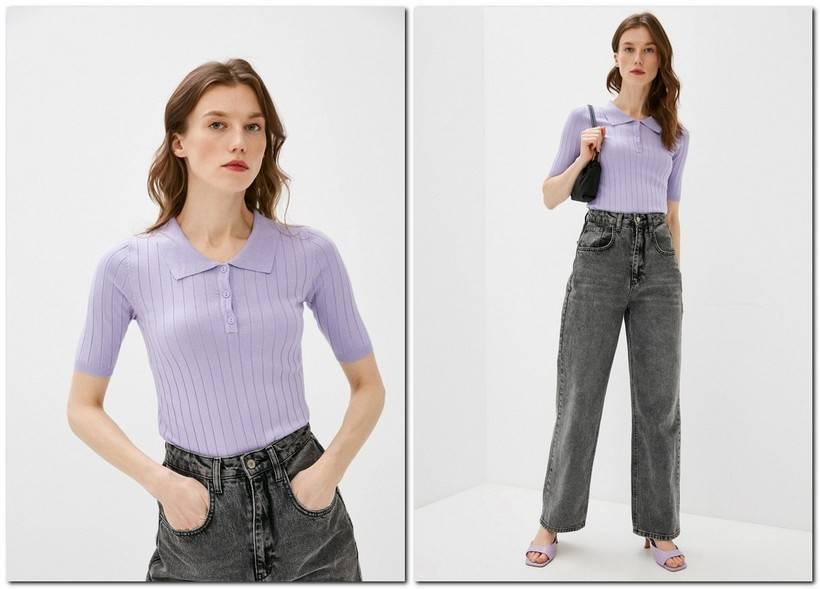 Женское поло под заправку — отличный вариант для прохладного времени года. Сочетается с джинсами, как это показано на фото. Поло под заправку способно скрыть недостатки фигуры. Это большое преимущество. Нежный сиреневый оттенок сочетается с джинсами тёмного тона. Оба цвета подчёркивают женственность образа.
