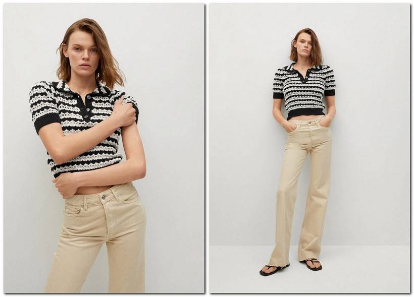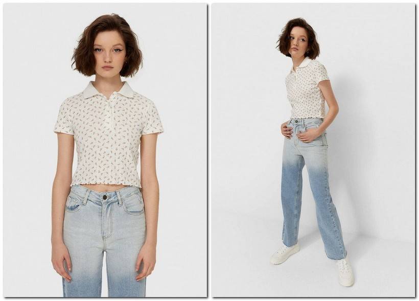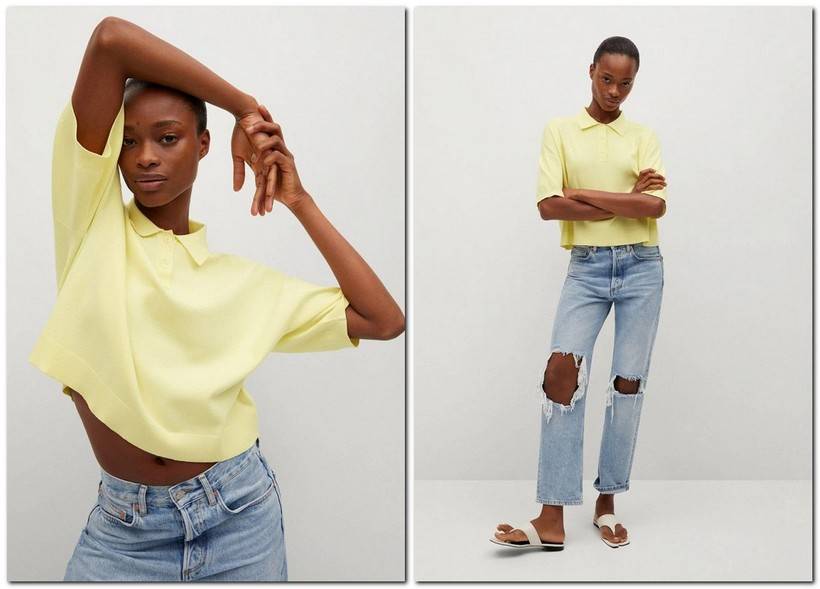 Особая форма поло — укороченная и расширенная, как на фото. Это тренд прошлого и нынешнего года. Яркий, но при том же нежный жёлтый оттенок позволит подчеркнуть индивидуальность женщины и выделить её из толпы. Сочетание с такими джинсами — отличный вариант для путешествия или отдыха. Женщина в таком образе почувствует себя не только свободно, но и будет ловить на себе взгляды окружающих.