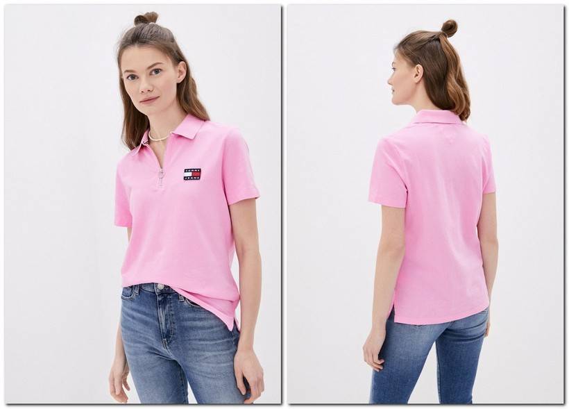 Удлиненное поло подойдёт для более спортивных девушек, которые находятся в постоянном движении или решили отправиться на посещение спортивного мероприятия. Особенность образа, представленного на фото — розовый цвет. Он придаёт женственности образу. Удлинённая форма поло также поможет скрыть некоторые незначительные недостатки, если они присутствуют.