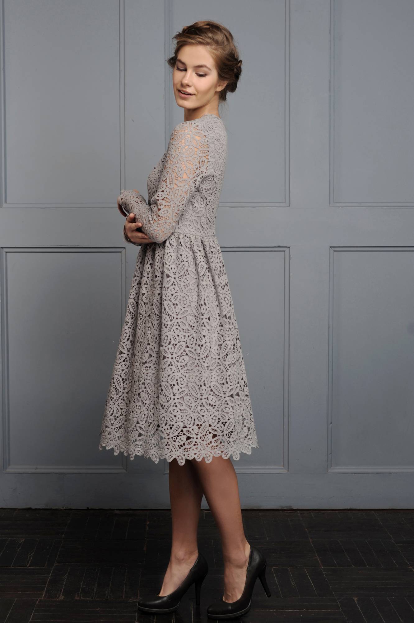 Однако платья с гипюра – это не только различные торжества и праздники. Для прохладной погоды можно выбрать комплект, состоящий из гипюрового платья и кожаной куртки или элегантного пальто. Если к такому платью подобрать обувь на массивной платформе или высокие сапоги, то получится необычный модный лук.