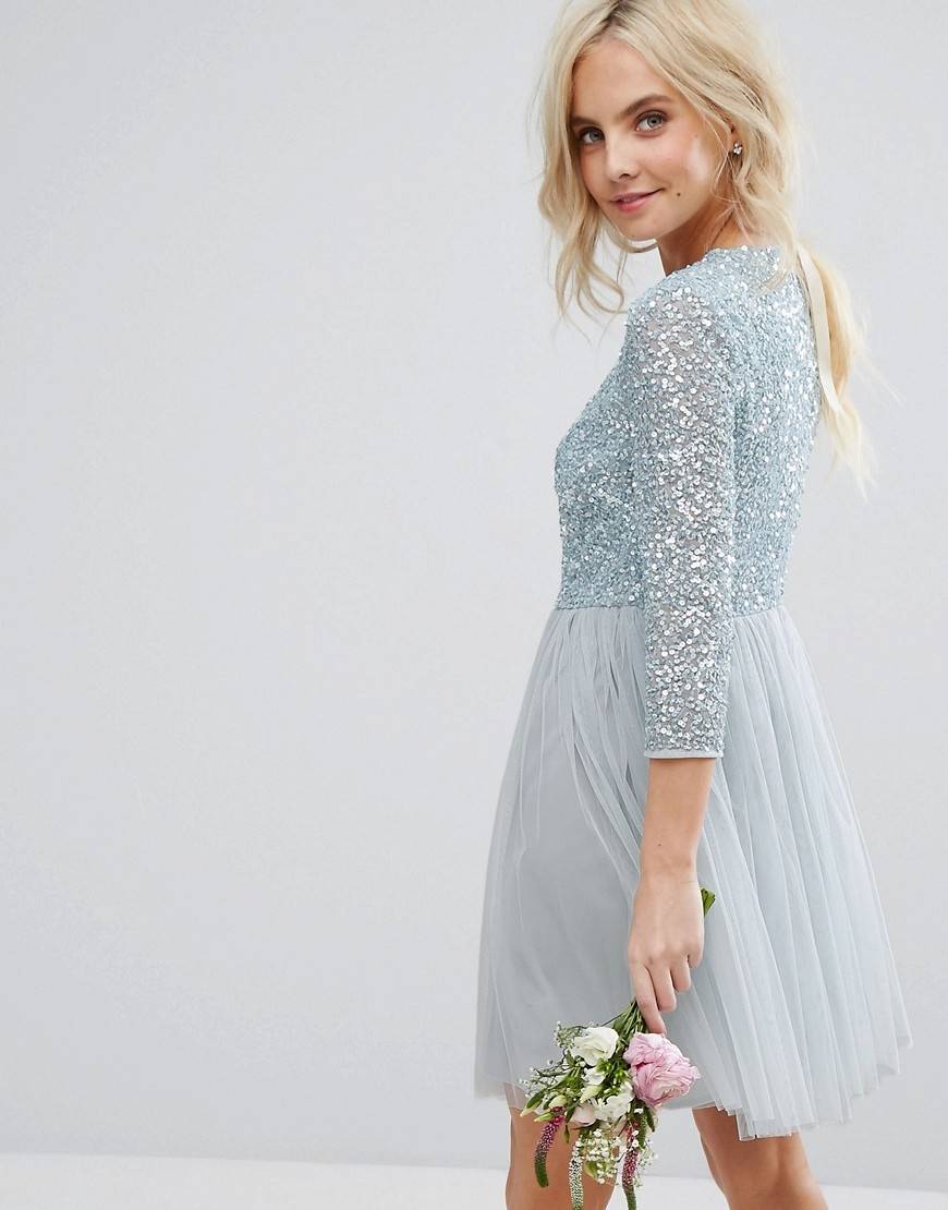 Матовый и блестящий атлас считают тяжелым материалом. К голубому наряду из такой ткани подбирают декор — вышивку или вставки из гипюра. Такие модели сохраняют фасон в течение всего дня.