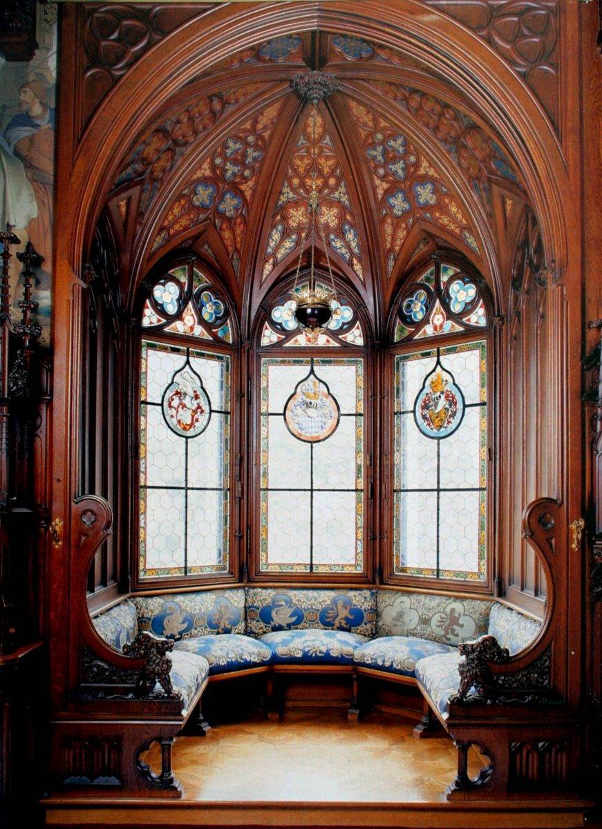 Классические окна для интерьера в стиле готика – стрельчатые. В городской квартире поставить подобные окна проблематично, а вот те, кто собирается оформить в таком стиле частный коттедж, могут предусмотреть нужную форму оконного проёма ещё на стадии проектирования.