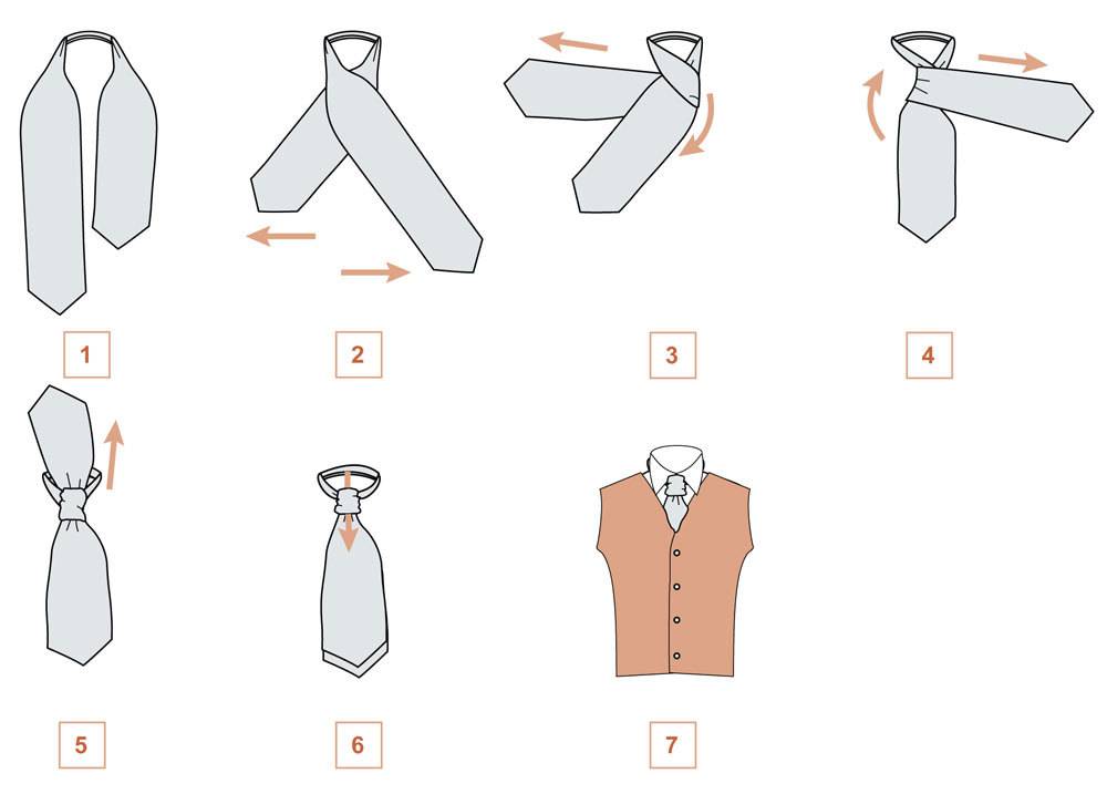Судя по схеме, можно понять, что завязывается платок аналогично галстуку. Но выглядят эти два аксессуара по-разному. Шейный платок следует красиво расправить и украсить булавкой.