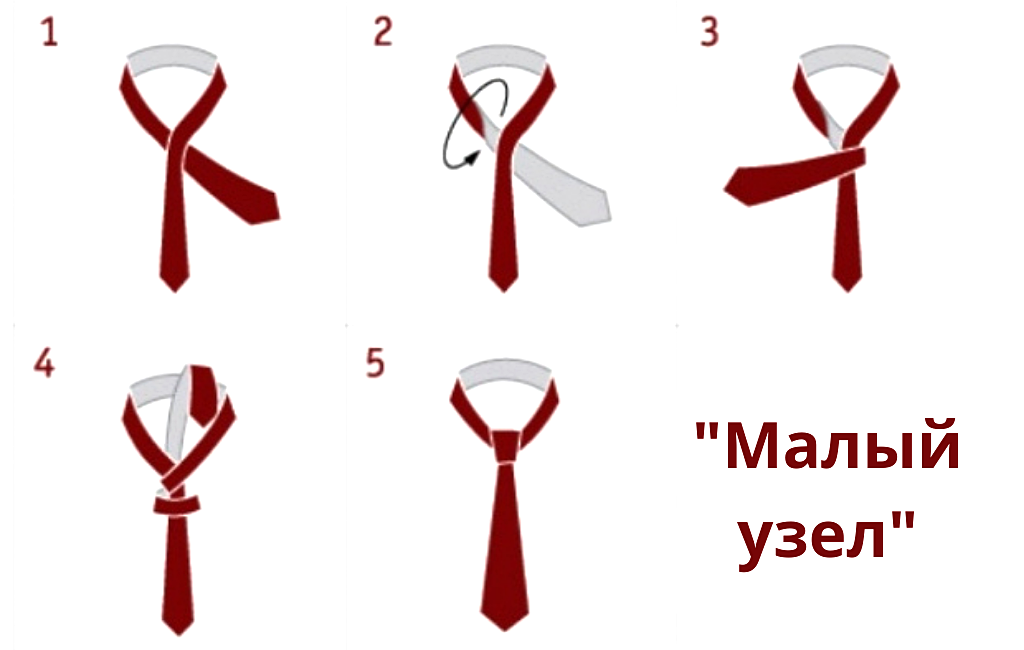 Если галстук слишком длинный, его стоит завязать малым узлом. Этот вариант отличается простотой и напоминает классический способ плетения. Он подойдет для работы и деловых мероприятий. При этом его могут использовать высокие и стройные мужчины.