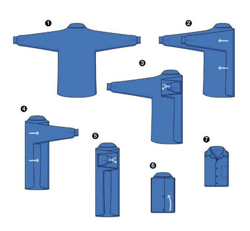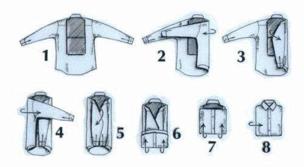 Этот метод универсальный, он подойдет как для того, чтобы сложить рубашки в шкафу, так и для того, чтобы уложить их в чемодан. Схема укладки следующая: