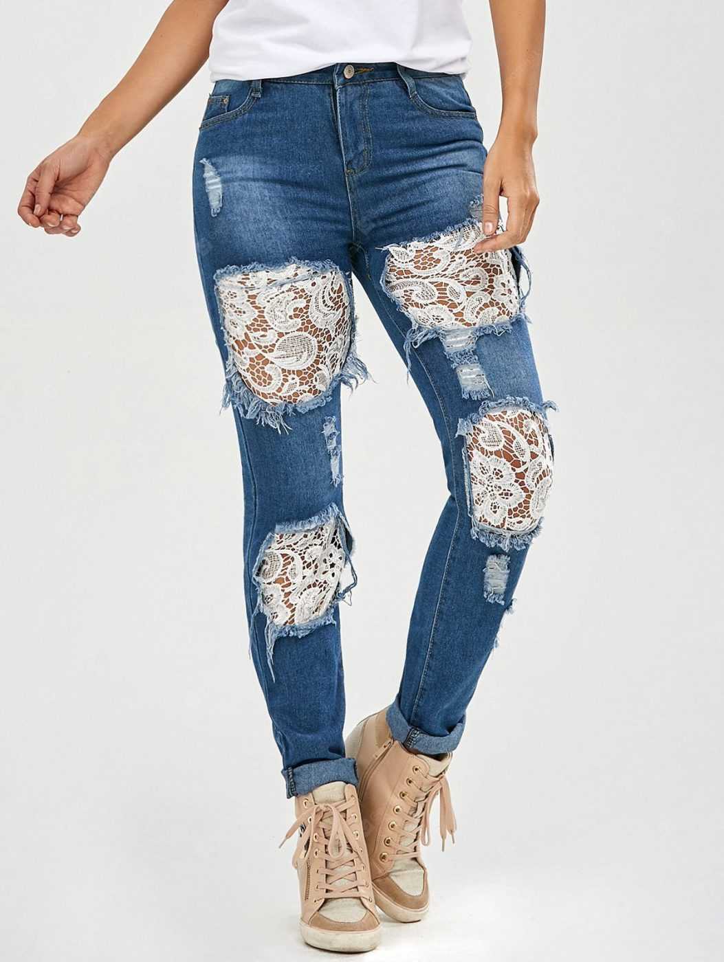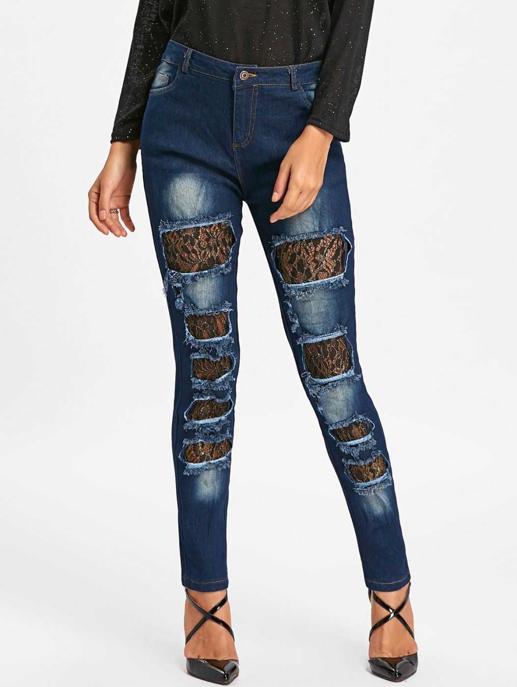 Особую женственность придают джинсам кружевные дырки. Чтобы сделать такие штаны в домашних условиях, используют ажурную ткань в качестве подкладки с тыльной стороны, делают кружевные нашивки на лицевой поверхности или надевают под брюки колготы с кружевными мотивами. Последний вариант хорош тем, что не требует использования швейной машинки, а также подходит тем, кто любит менять образ и носить дырявые джинсы с кружевной подкладкой и без нее.