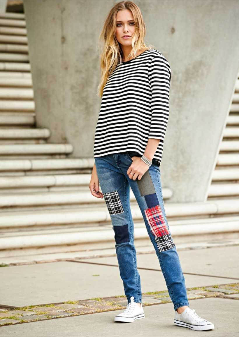 Полосатая тенниска отлично сочетается с обтягивающими джинсами.