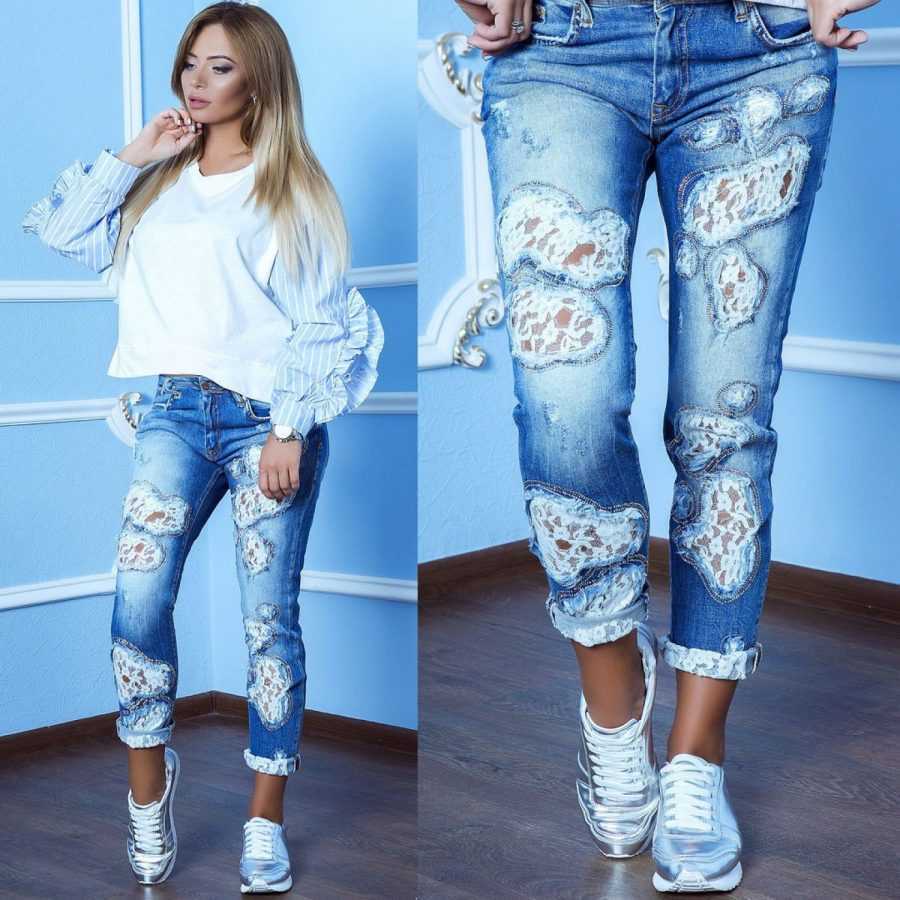 Разобравшись, как самостоятельно сделать дырки на джинсах, стоит рассмотреть способы их заделки. У такого варианта декора есть одно неоспоримое преимущество – брюки можно будет носить в холодный сезон или немного прикрыть тело, которое просматривается в отверстия. В зависимости от сезонности вещи для заделки дырок применяют кружево или латки из плотной ткани.