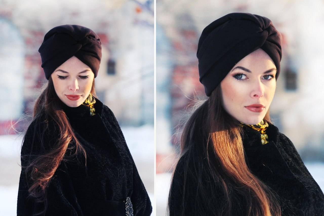 В области лба у такой шапки находится перекрестие или узел, создается впечатление, что вязаное полотно просто намотано на голову. Но технически современная чалма – это шапка бини с треугольным вырезом на лбу, поэтому носить ее очень удобно. Нередко чалму украшают брошью, так головной убор смотрится еще более нарядно и солидно.