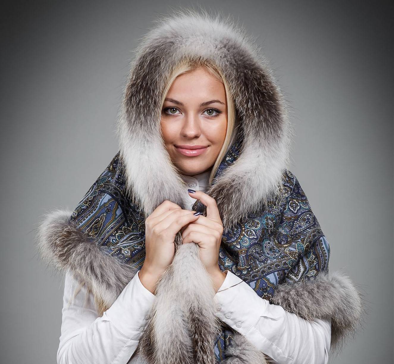 Серая, если шуба с переливами, градиентом меха — он должен повторяться в головном уборе. Например, шиншилловые манто носят с такими же шапками. Изделия без воротника — с капором из меха.