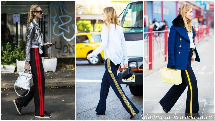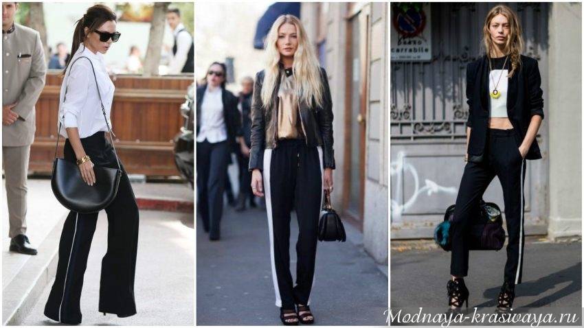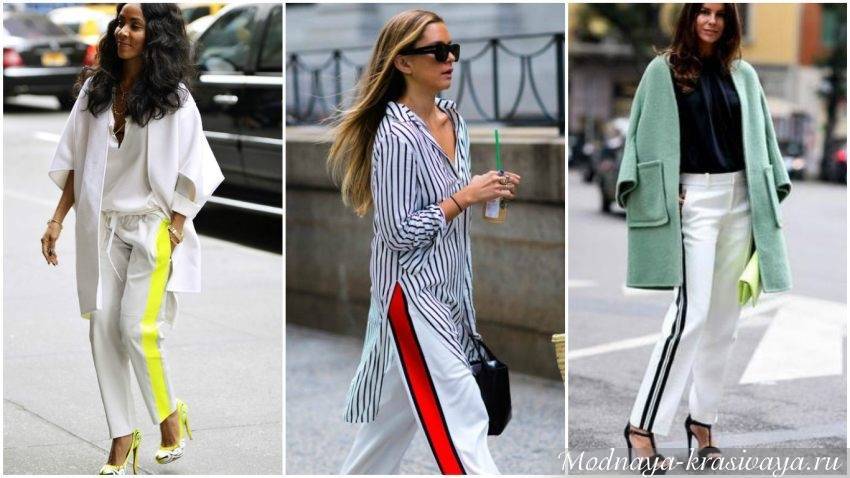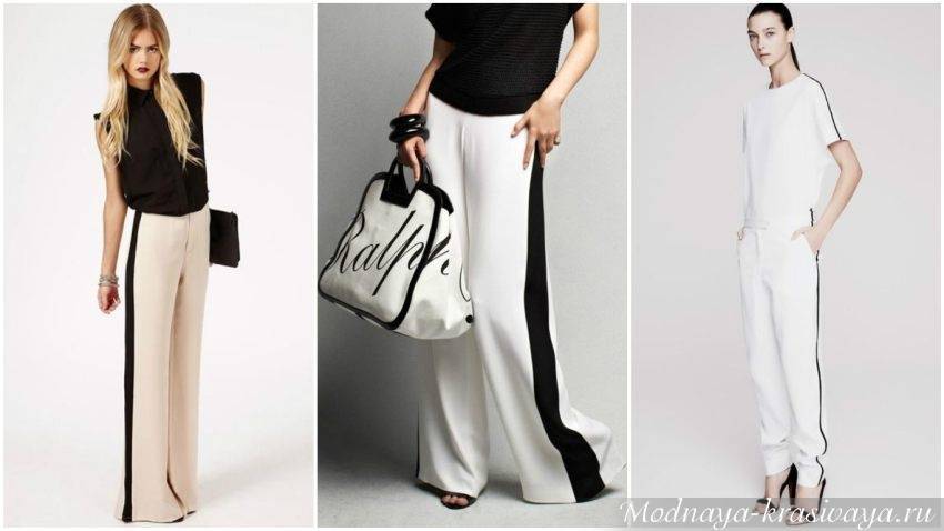 Черные с белыми полосками брюки или белые с черными – один из нестареющих хитов сезона. Сочетание серого и черного или бежевого – смотрится стильно. Лампасы могут быть как в виде сплошных полосок из той же ткани, так и оригинальные – например из кружева.
