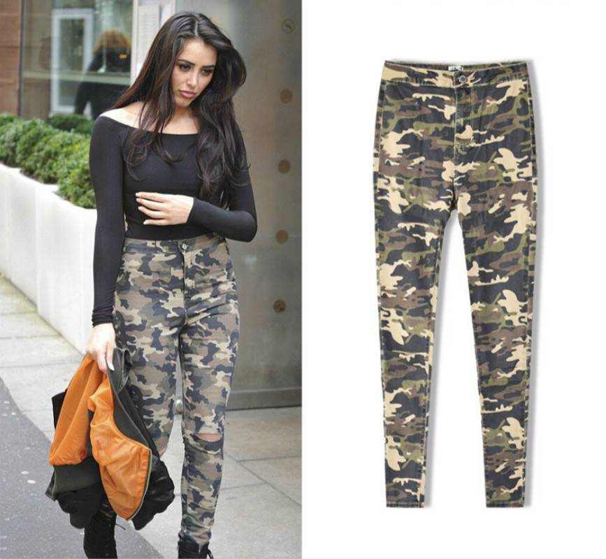 В 2021 году популярностью пользуются женские брюки с камуфляжным принтом, которые визуально увеличивают длину ног