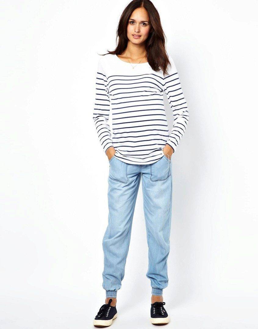 Практичные джинсы с резинкой внизу отличаются достаточно свободным кроем в области ног. Резинка на поясе присутствует на облегающих моделях. Любой вариант подходит для создания эффектного наряда. Наиболее интересными и универсальными являются следующие сочетания: