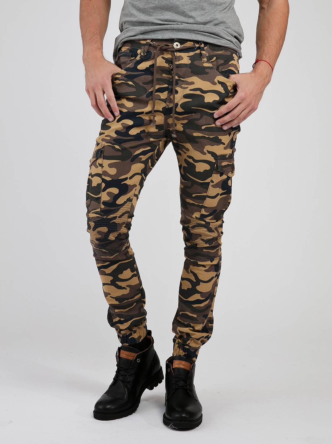 Камуфляжный низ на резинке шикарно выглядит совместно со спортивной футболкой, туфлями, большими солнцезащитными очками. Добавить нотку хулиганства помогут камуфляжные узоры. Кеды, шляпка могут быть в едином цвете. Однотонная майка, ботинки на шнуровке с массивным каблуком выглядят оригинально в сочетании с зауженными штанами.
