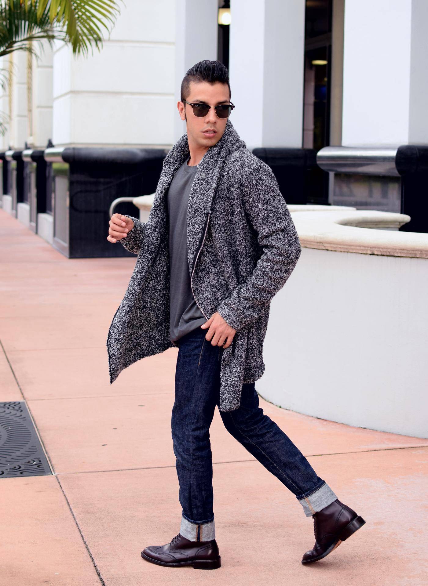 Мужские модели уже давно стали неотъемлемой частью гардероба. При выборе стоит помнить, что в тренде всегда будут короткие прямые кардиганы на пуговицах, дополняющие строгий деловой стиль: зауженные брюки, сорочку, узкий однотонный галстук. Более длинные и свободные модели подойдут абсолютно к любым элементам одежды, от коротких джинсовых шорт и майки, до летних брюк и легкой рубашки навыпуск. Даже под вязаные теплые модели часто надевают однотонные футболки без рисунка. Кардиган придает образу мужественности, особенно если он с грубым воротником, обтягивающими рукавами. Для полного завершения дизайнерского решения можно подобрать стильную кожаную сумку или не менее уникальную папку.