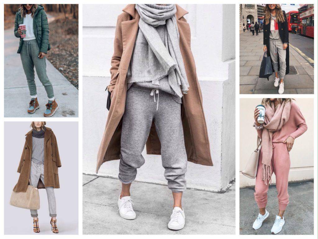 Широкие штаны комбинируется с облегающими вещами: майками, топами в спортивном стиле. Подходят толстовки и ветровки по фигуре. Облегающие модели лучше смотрятся с объемными толстовками, худи и свитшотами. Если на спортивных штанах есть яркий принт, то верх должен быть однотонным.