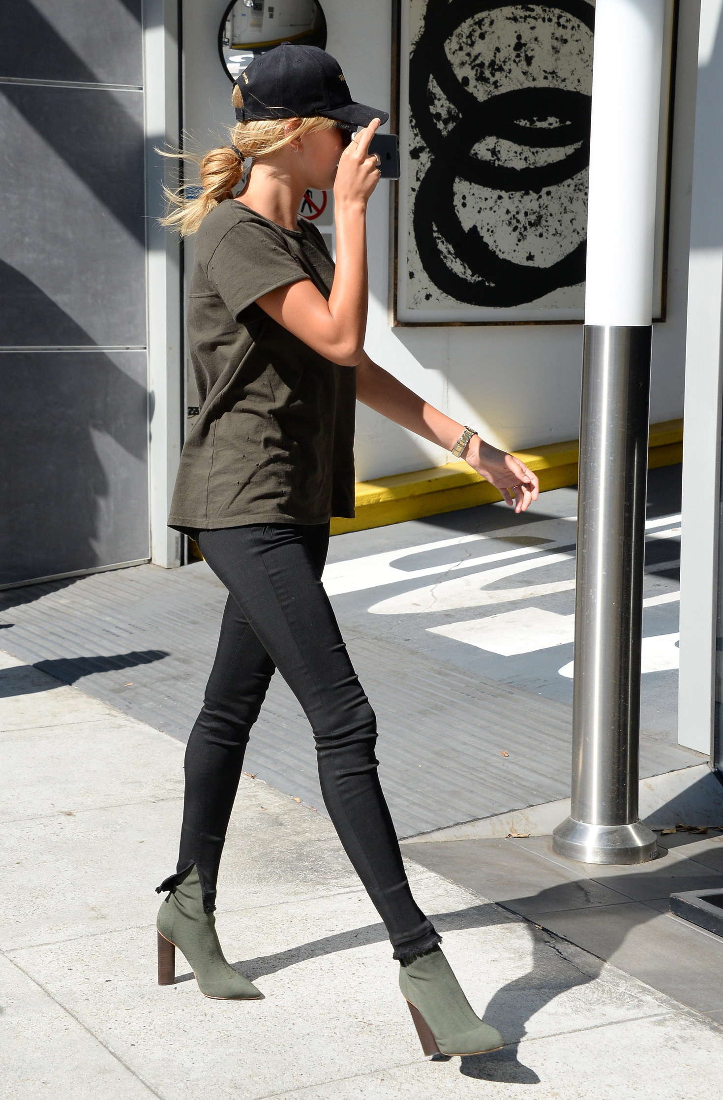 - Со светло-голубыми джинсами и шляпкой.