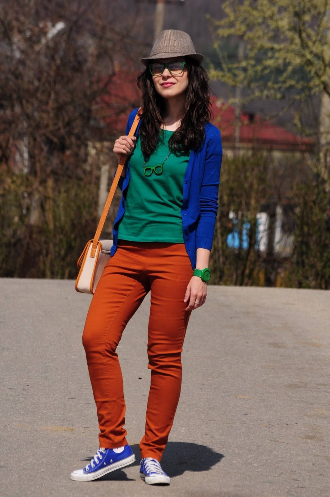 Красно-коричневые цвета (с красным подтоном) – «красное дерево», кирпичный, медно-коричневый и др. Довольно пестрый цвет. Чаще всего используется в кожаных изделиях, удачно смотрится в замше, в обуви и в аксессуарах. Брюки подобных оттенков – вариант для очень смелых девушек, потому как они зрительно будут выделятся из общего ансамбля. А потому они просто требуют, чтобы их уравновесили либо столь же ярким верхом, либо крупными заметными аксессуарами, в противном случае есть риск перегрузить нижнюю часть тела и добавить себе лишних килограммов. Лучше смотрятся с яркими, пестрыми расцветками. Желательно избегать сочетания с темными цветами в верхней части.