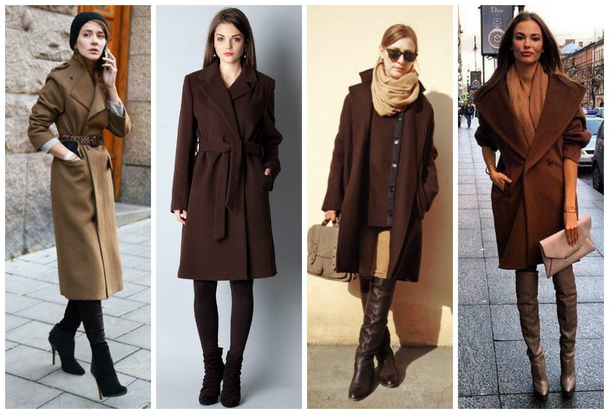 Одним из главных элементов в образе с верхней одеждой считается обувь. Завершение обеспечивает практичность и устойчивость, что влияет на комфорт и уверенность образа. Кроме того, с помощью этой детали можно добавлять в лук яркий акцент. Самыми актуальными остаются темные расцветки – черный, шоколадный, серый дизайн. Но в тренде и броские решения в красном, желтом, электрическом синем или с принтом под леопарда. Но давайте же посмотрим, с чем носить пальто коричневого цвета: