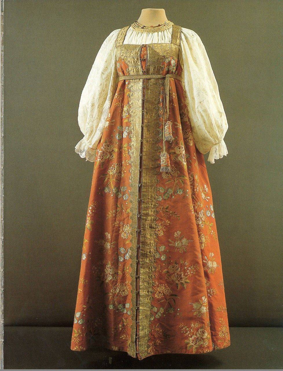 Также известно, что в XVII веке на Руси сарафаном называли женскую горничную (домашнюю) одежду, надевающуюся через голову. Позже он стал не только будничным одеянием, праздничные наряды и сарафаны для выхода в свет шились из дорогих тканей и богато украшались различными камнями, из-за чего могли весить несколько килограммов.