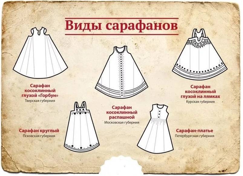 Самый древняя его модель — глухой сарафан в виде туники — изготавливался из одного загнутого пополам куска материала, образующего обе части изделия. С боков были широкие клинья.