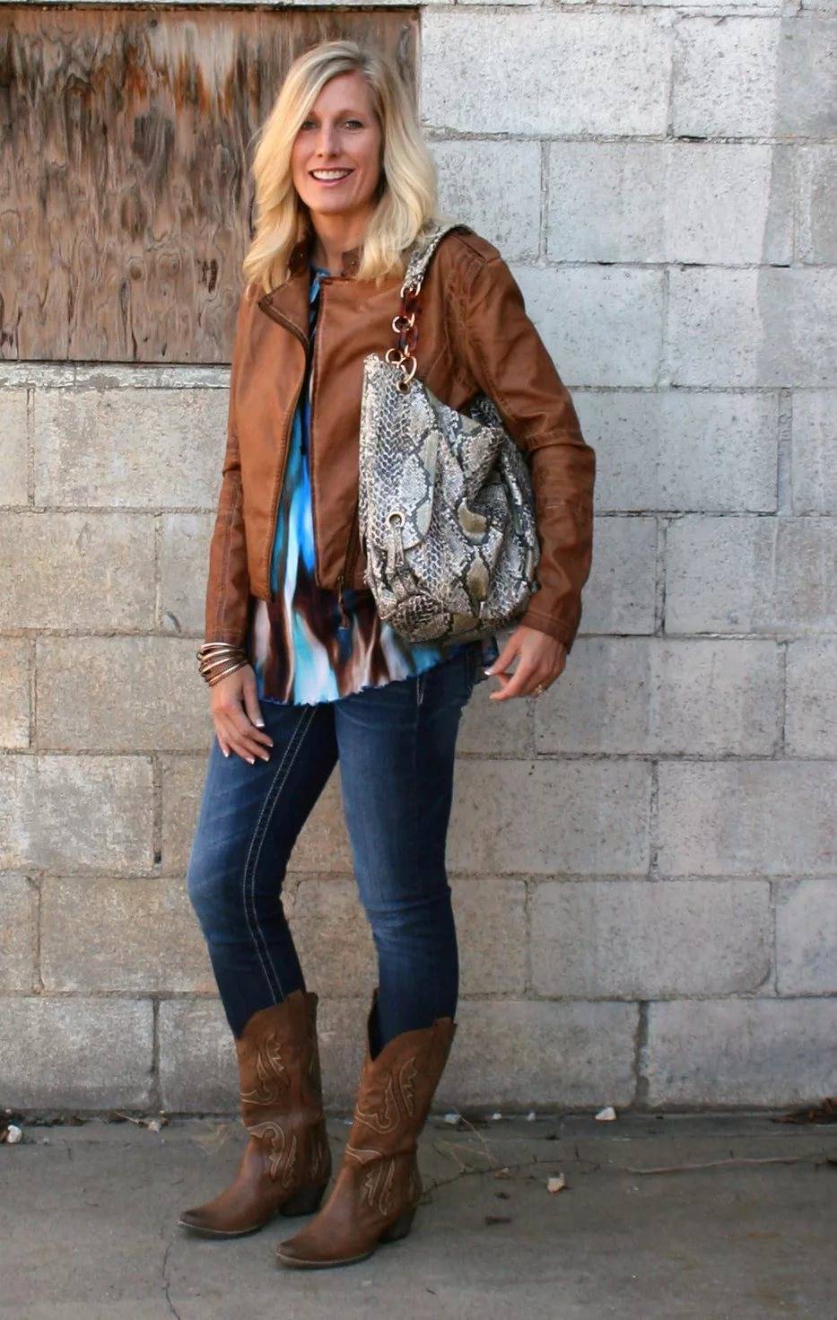 - Джинсовка. Легкая осенняя или зимняя на меху джинсовая куртка и ковбойские сапоги – классическая пара.
